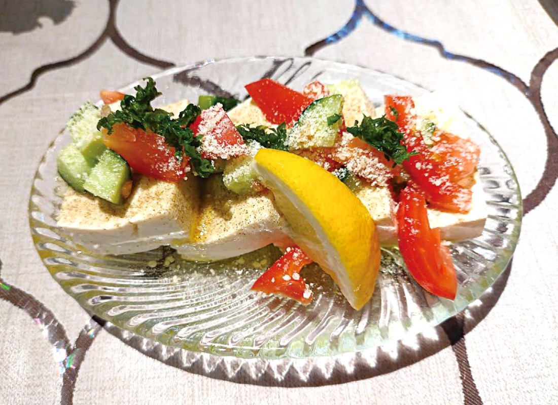 カットした三層とうふに塩コショウで味付け、お好みの野菜を盛りつけ、オリーブオイルと粉チーズをトッピング。